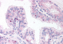 Immunohistochemistry: Paraffin-embedded Human prostate tissue. Antigen Retrieval: Steam tissue section in Citrate buffer (pH 6.0). The tissue section was stained with ARG63887 anti-ERG antibody at 10 µg/ml dilution followed by AP-staining.