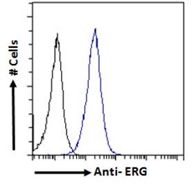 Flow Cytometry: Paraformaldehyde-fixed MCF7 cells permeabilized with 0.5% Triton. Cells were stained with ARG63887 anti-ERG antibody (blue line) at 10 µg/ml dilution for 1 hour, followed by incubation with Alexa FluorR 488 labelled secondary antibody. IgG control: Unimmunized goat IgG (black line).