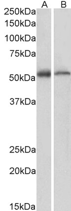 Western blot: 35 µg of Human thymus (A) and Mouse thymus (B) lysates (in RIPA buffer) stained with ARG63510 anti-ETEA / UBXD8 antibody at 1 µg/ml dilution and incubated at RT for 1 hour.
