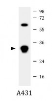 Western blot: 35 µg of A431 cell lysate stained with ARG55364 anti-ETFA antibody at 1:1000 dilution.