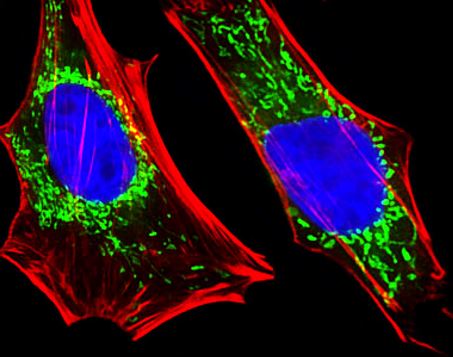 Immunofluorescence: HeLa cells stained with ARG55364 anti-ETFA antibody (green) at 1:25 dilution. Cytoplasmic actin was counterstained with Alexa Fluor® 555 conjugated with Phalloidin (red). DAPI (blue) for nuclear staining.