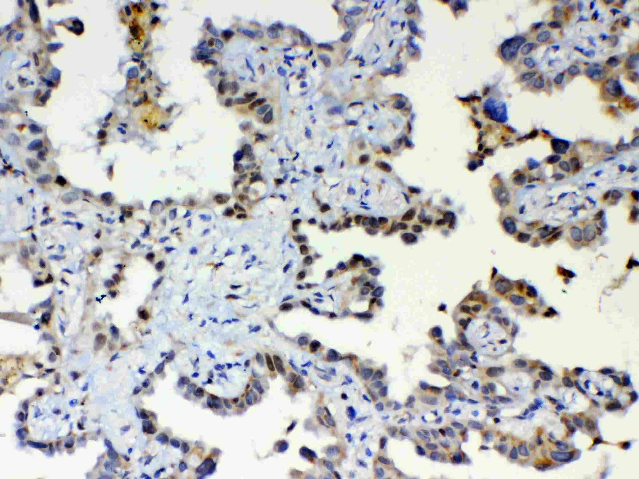 Immunohistochemistry: Paraffin-embedded Human lung cancer tissue. Antigen Retrieval: Heat mediated was performed in Citrate buffer (pH 6.0) for 20 min. The tissue section was blocked with 10% goat serum. The tissue section was then stained with 1 µg/ml ARG58570 anti-ETV6 / Tel antibody overnight at 4°C.