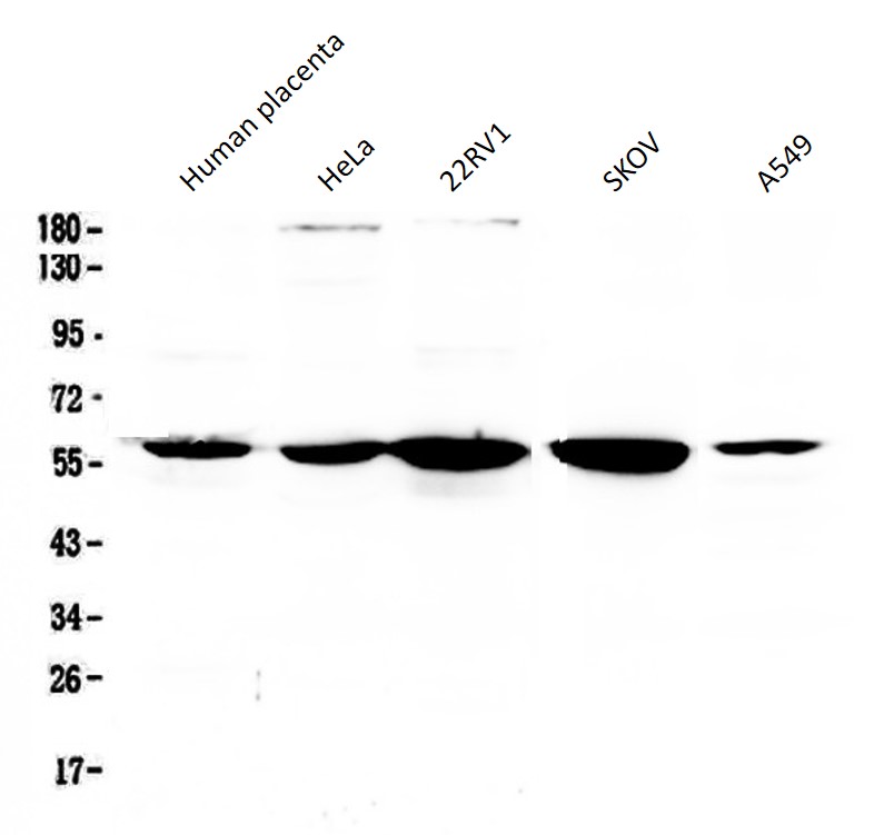 Western blot: 50 µg of Human placenta, HeLa, 22RV1, SKOV and A549 lysates stained with ARG58570 anti-ETV6 / Tel antibody at 0.5 µg/ml, overnight at 4°C, under reducing conditions.