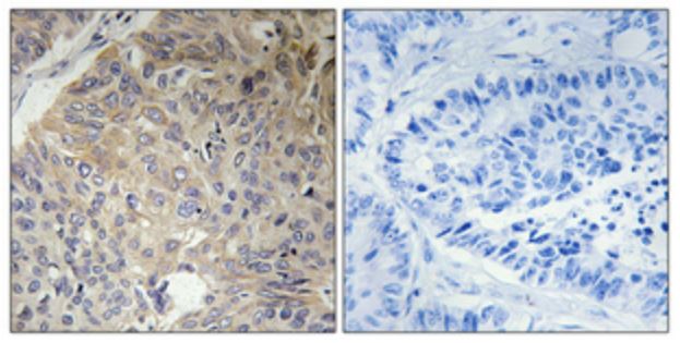 Immunohistochemistry: Paraffin-embedded Human lung cancer tissue stained with ARG66668 anti-Eg 5 antibody at 1:100 dilution, overnight at 4°C. Antigen Retrieval: High-pressure and temperature Tris/EDTA buffer (pH 8.0). Negative control (right): Antibody was pre-absorbed by immunogen peptide.