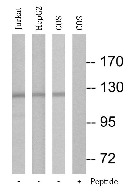 Western blot: Jurkat, HepG2 and COS cell lysates stained with ARG66668 anti-Eg 5 antibody. The lane on the right is blocked with the synthetic peptide.