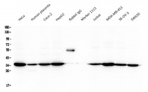 Western blot: 50 µg of HeLa, Human placenta, Caco-2, HepG2, Rabbit IgG, Marker 1113, Jurkat, MDA-MB-453, SK-OV-3 and SW620 lysates stained with ARG58577 anti-Emerin antibody [5A10] at 0.5 µg/ml, overnight at 4°C, under reducing conditions.