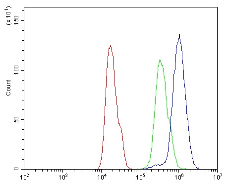 Flow Cytometry: A431 cells were blocked with 10% normal goat serum and then stained with ARG58577 anti-Emerin antibody [5A10] (blue) at 1 µg/10^6 cells for 30 min at 20°C, followed by incubation with DyLight®488 labelled secondary antibody. Isotype control antibody (green) was mouse IgG (1 µg/10^6 cells) used under the same conditions. Unlabelled sample (red) was also used as a control.