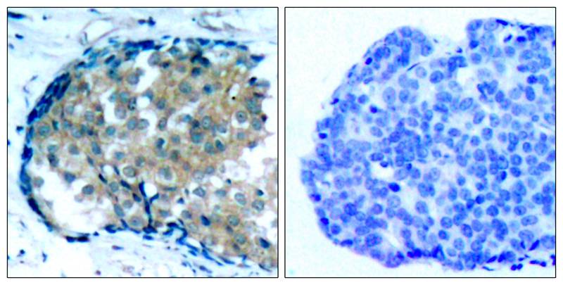 Immunohistochemistry: Paraffin-embedded Human breast carcinoma tissue stained with ARG51566 anti-Ezrin phospho (Tyr353) antibody (left) or the same antibody preincubated with blocking peptide (right).