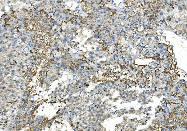 Immunohistochemistry: Paraffin-embedded Human liver cancer tissue. Antigen Retrieval: Heat mediation was performed in EDTA buffer (pH 8.0). The tissue section was blocked with 10% goat serum. The tissue section was then stained with ARG43233 anti-FGB / Fibrinogen beta chain antibody [6D12] at 2 µg/ml dilution, overnight at 4°C.