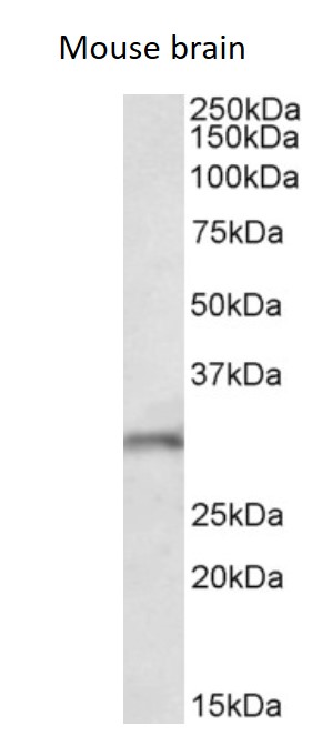 Western blot: 35 µg of Mouse brain lysate (in RIPA buffer) stained with ARG58620 anti-FGF14 antibody at 1 µg/ml dilution. Primary incubation was 1 hour. Detected by chemiluminescence.