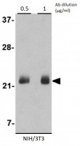 Western blot: NIH/3T3 cell lysate stained with ARG58626 anti-FGF4 antibody at 0.5 and 1 µg/ml dilution.