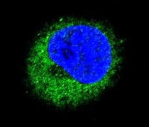 Immunofluorescence: MDA-MB-231 cells stained with ARG55365 anti-FGR antibody (green). DAPI (blue) for nuclear staining.