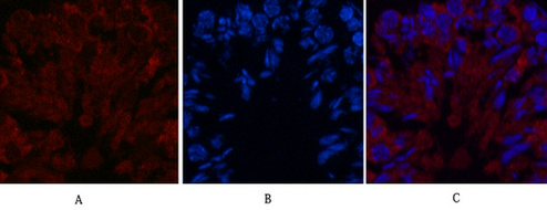 Immunohistochemistry: Mouse testis tissue stained with ARG66171 anti-FH / Fumarase antibody (red) at 1:200 dilution (4°C, overnight).