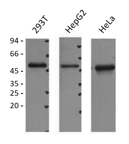 Western blot: 1) 293T, 2) HepG2, and 3) HeLa cell lysates stained with ARG66171 anti-FH / Fumarase antibody at 1:3000 dilution.