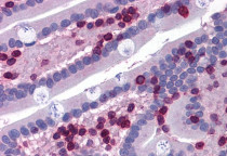 Immunohistochemistry: Paraffin-embedded Human small intestine tissue. Antigen Retrieval: Steam tissue section in Citrate buffer (pH 6.0). The tissue section was stained with ARG64056 anti-FLAP / ALOX5AP antibody at 3.75 µg/ml dilution followed by AP-staining.