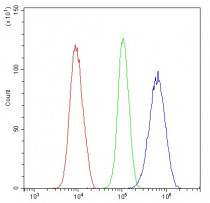 Flow Cytometry: U2OS cells were blocked with 10% normal goat serum and then stained with ARG58698 anti-FLT4 / VEGFR3 antibody (blue) at 1 µg/10^6 cells for 30 min at 20°C, followed by incubation with DyLight®488 labelled secondary antibody. Isotype control antibody (green) was rabbit IgG (1 µg/10^6 cells) used under the same conditions. Unlabelled sample (red) was also used as a control.