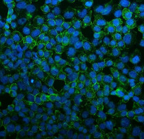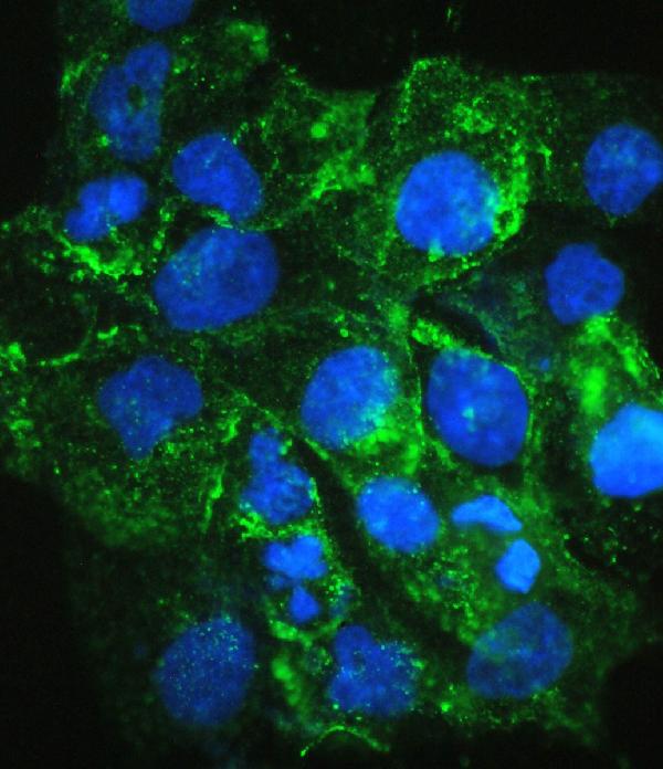 Immunofluorescence: A431 cells were blocked with 10% goat serum and then stained with ARG58698 anti-FLT4 / VEGFR3 antibody (green) at 2 µg/ml dilution, overnight at 4°C. DAPI (blue) for nuclear staining.