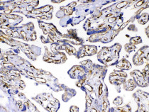 Immunohistochemistry: Paraffin-embedded Human placenta tissue. Antigen Retrieval: Heat mediated was performed in Citrate buffer (pH 6.0) for 20 min. The tissue section was blocked with 10% Goat serum. The tissue section was then stained with ARG58698 anti-FLT4 / VEGFR3 antibody at 1 µg/ml, overnight at 4°C.