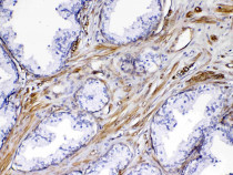 Immunohistochemistry: Paraffin-embedded Human prostatic cancer tissue. Antigen Retrieval: Heat mediated was performed in Citrate buffer (pH 6.0) for 20 min. The tissue section was blocked with 10% Goat serum. The tissue section was then stained with ARG58698 anti-FLT4 / VEGFR3 antibody at 1 µg/ml, overnight at 4°C.