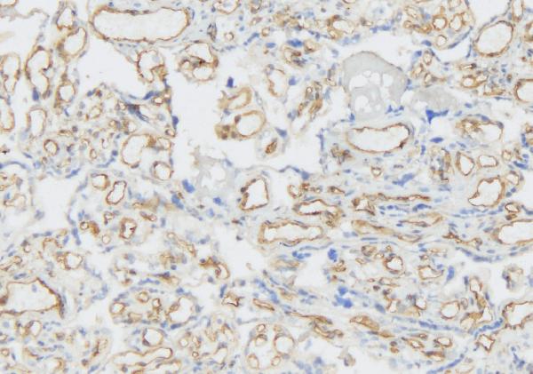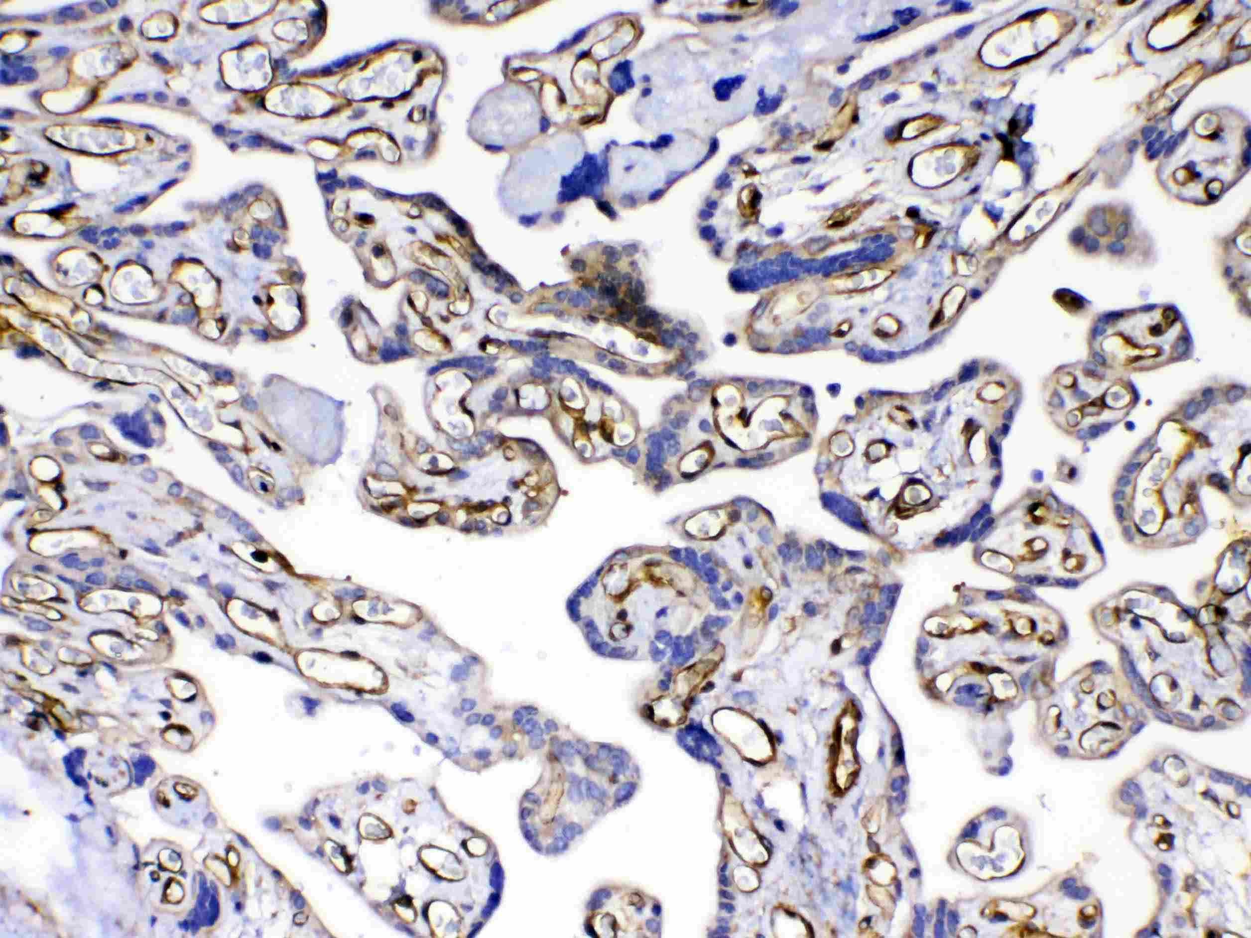 Immunohistochemistry: Frozen section of Human placenta tissue. The tissue section was blocked with 10% goat serum. The tissue section was then stained with ARG58698 anti-FLT4 / VEGFR3 antibody at 1 µg/ml dilution, overnight at 4°C.