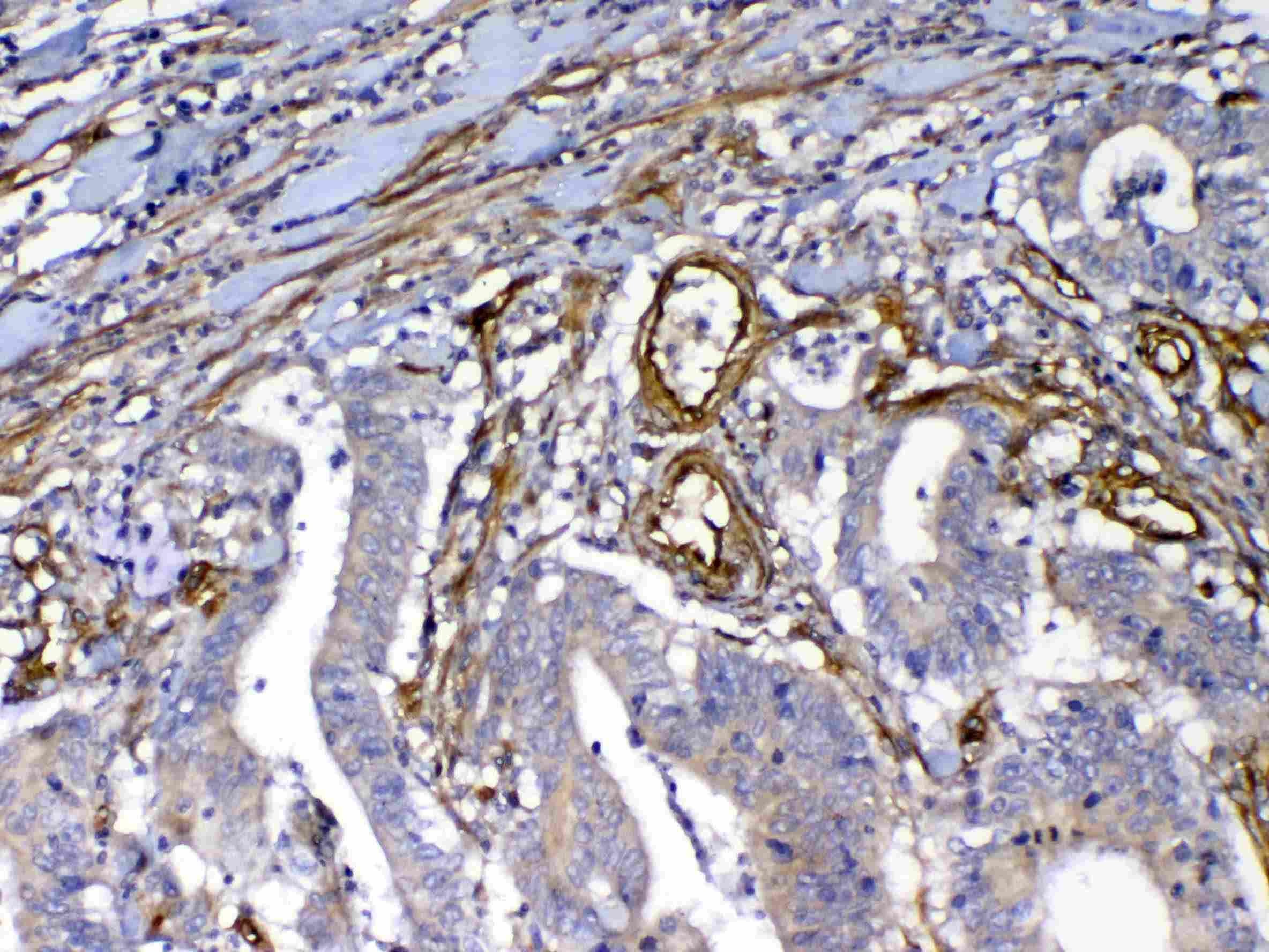 Immunohistochemistry: Paraffin-embedded Human rectal cancer tissue. Antigen Retrieval: Heat mediated was performed in Citrate buffer (pH 6.0) for 20 min. The tissue section was blocked with 10% Goat serum. The tissue section was then stained with ARG58698 anti-FLT4 / VEGFR3 antibody at 1 µg/ml, overnight at 4°C.