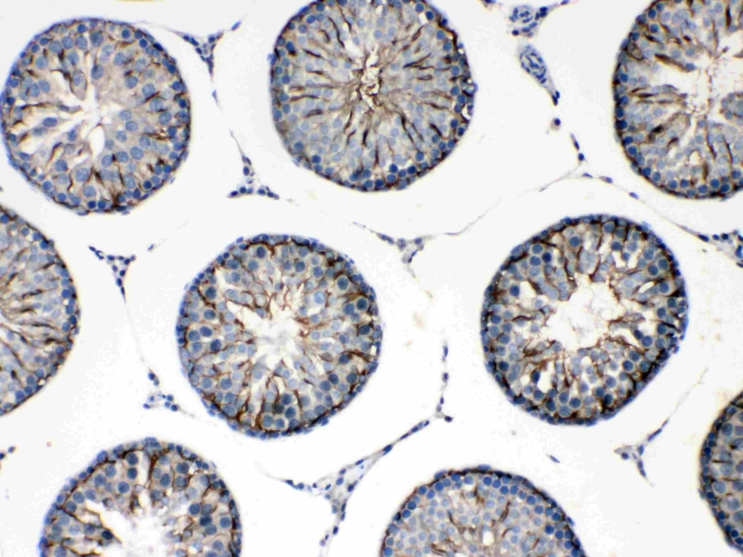 Immunohistochemistry: Paraffin-embedded Rat testis tissue. Antigen Retrieval: Heat mediated was performed in Citrate buffer (pH 6.0, epitope retrieval solution) for 20 min. The tissue section was blocked with 10% goat serum. The tissue section was then stained with ARG59438 anti-FMN1 antibody at 1 µg/ml, overnight at 4°C.