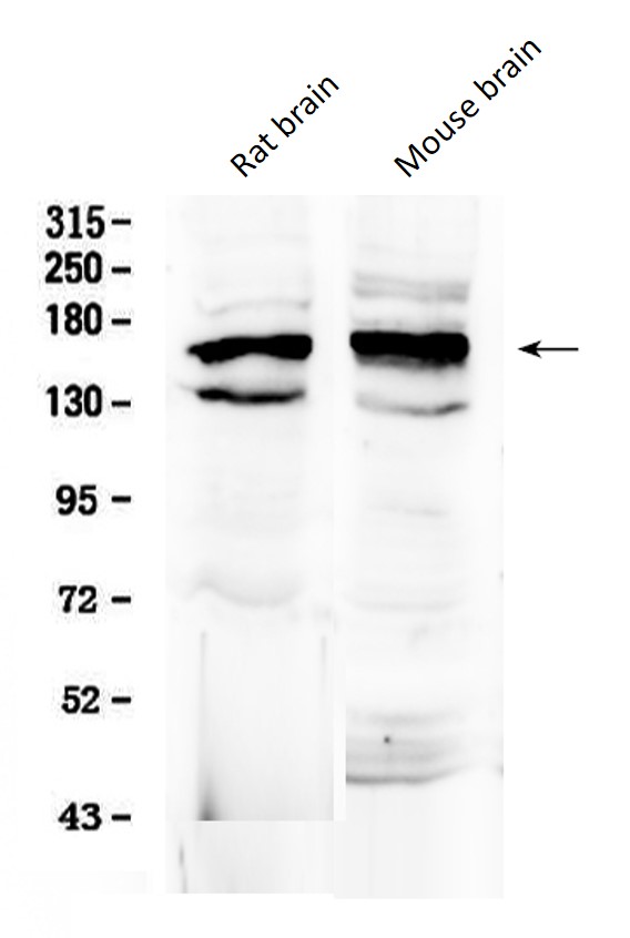 Western blot: 50 µg of samples under reducing conditions. Rat brain and Mouse brain lysates stained with ARG59438 anti-FMN1 antibody at 0.5 µg/ml, overnight at 4°C.