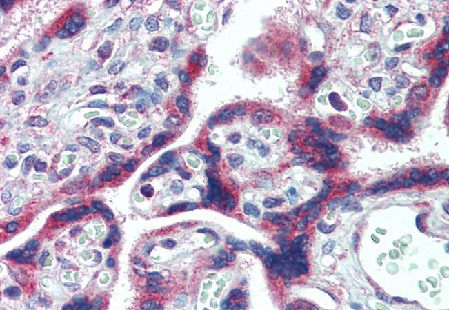 Immunohistochemistry: Paraffin-embedded Human placenta tissue. Antigen Retrieval: Steam tissue section in Citrate buffer (pH 6.0). The tissue section was stained with ARG64529 anti-FMRP antibody at 2.5 µg/ml dilution followed by AP-staining.