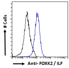 Flow Cytometry: Paraformaldehyde-fixed HeLa cells permeabilized with 0.5% Triton. Cells were stained with ARG63369 anti-FOXK2 / ILF antibody (blue line) at 10 µg/ml dilution for 1 hour, followed by incubation with Alexa FluorR 488 labelled secondary antibody. IgG control: Unimmunized goat IgG (black line).