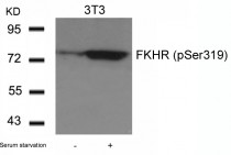 Western blot: Extracts from 3T3 cells untreated or treated with serum starvation stained with ARG51636 anti-FOXO1 / FKHR phospho (Ser319) antibody.