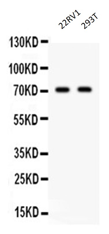 Western blot: 40 µg of 22RV1 and 293T whole cell lysates stained with ARG59221 anti-FZD1 / Frizzled 1 antibody at 0.5 µg/ml dilution.