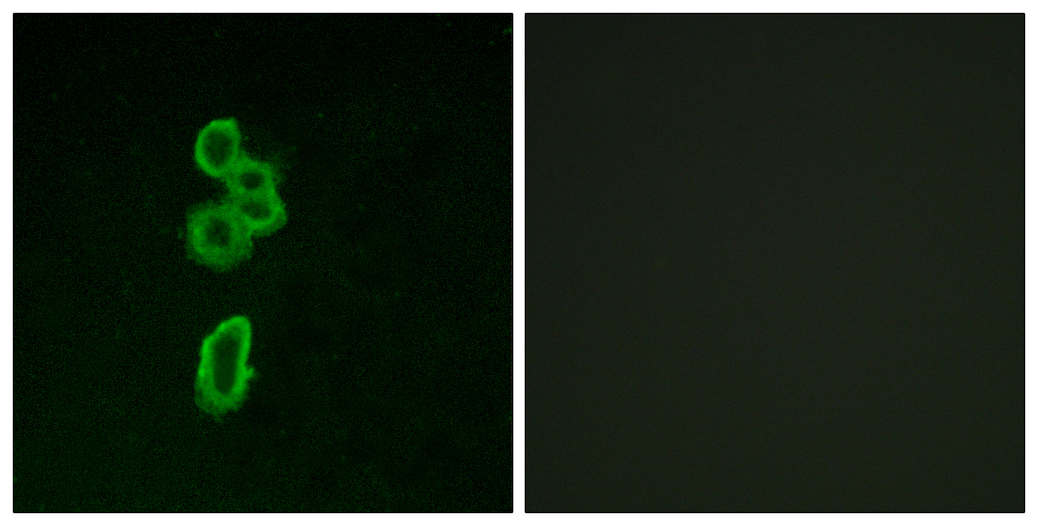 Immunofluorescence: MCF7 cells stained with ARG66566 anti-FZD6 / Frizzled 6 antibody. The picture on the right is blocked with the synthetic peptide.