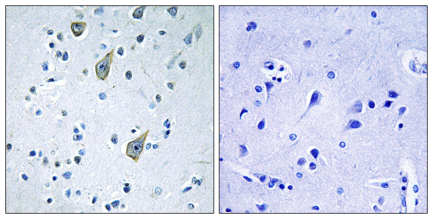 Immunohistochemistry: Paraffin-embedded Human brain tissue stained with ARG66566 anti-FZD6 / Frizzled 6 antibody. The picture on the right is blocked with the synthetic peptide.
