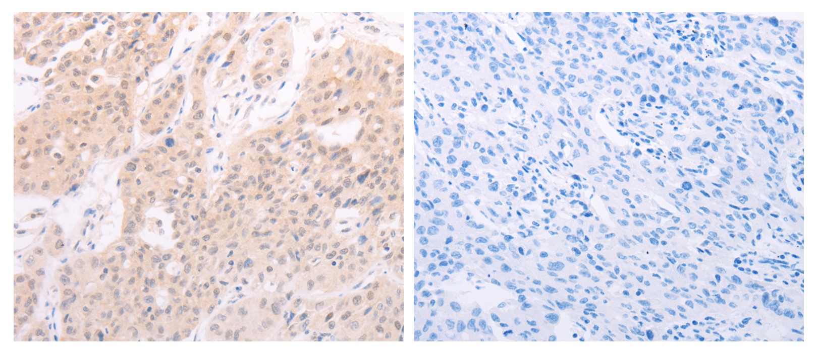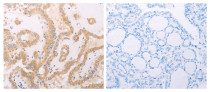 Immunohistochemistry: Paraffin-embedded Human lung cancer tissue stained with ARG42853 anti-Factor VII antibody (left) at 1:40 dilution, or the same antibody pre-incubated with fusion protein (right). (Original magnification: X200).