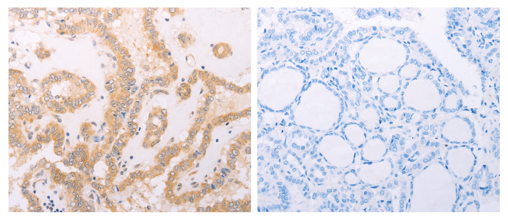 Immunohistochemistry: Paraffin-embedded Human thyroid cancer tissue stained with ARG42853 anti-Factor VII antibody (left) at 1:40 dilution, or the same antibody pre-incubated with fusion protein (right). (Original magnification: X200).