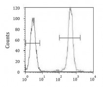 Flow Cytometry: HeLa cells stained with ARG55884 anti-Fatty Acid Synthase antibody (right histogram) or without primary antibody control (left histogram), followed by incubation with FITC labelled secondary antibody.