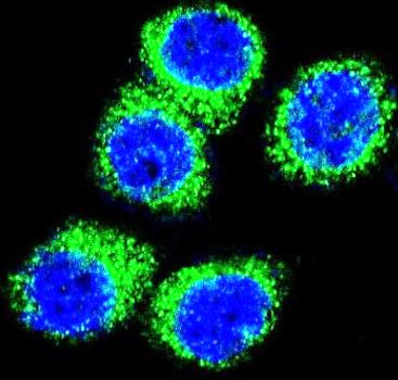 Immunofluorescence: HeLa cells stained with ARG55884 anti-Fatty Acid Synthase antibody (green). DAPI (blue) for nuclear staining.