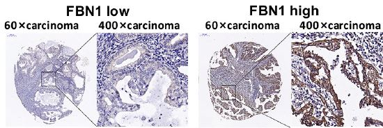 Immunohistochemistry: Human esophageal carcinoma and paired para-carcinoma stained with ARG66654 anti-Fibrillin 1 antibody.