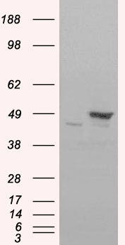 Western Blot: 1). Mock transfection; 2) FLOT1(RC200231) expressing plasmid transfected HEK293 cell lysate standed with ARG63473 anti-Flotillin 1 antibody