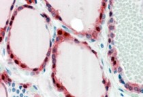 Immunohistochemistry: paraffin embedded Human Thyroid Gland. (Steamed antigen retrieval with citrate buffer pH 6) stained with ARG64623 anti-Frizzled 2 antibody at 2.5 µg/ml dilution followed by AP-staining.