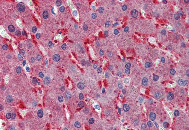 Immunohistochemistry: Paraffin-embedded Human liver tissue. Antigen Retrieval: Steam tissue section in Citrate buffer (pH 6.0). The tissue section was stained with ARG64623 anti-Frizzled 2 antibody at 2.5 µg/ml dilution followed by AP-staining.