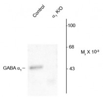 | Application Note | Specific for the ~51k α1-subunit of the GABAA receptor in Western blots. Labeling is absent in α1-subunit knockout animals. * The dilutions indicate recommended starting dilutions and the optimal dilutions or concentrations should be determined by the scientist. |