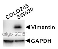 Western blot: 20 µg of COLO205 and SW620 cell lysates stained with ARG66302 anti-Vimentin antibody [SQab1859] at 1:2000 dilution and ARG65680 anti-GAPDH antibody at 1:10000 dilution.