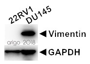 Western blot: 20 µg of 22RV1 and DU145 cell lysates stained with ARG66302 anti-Vimentin antibody [SQab1859] at 1:2000 dilution and ARG65680 anti-GAPDH antibody at 1:10000 dilution.