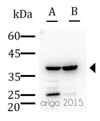 Western blot: 30 µg of 1) MDA-MB-231, and 2) MCF-7 lysates stained with ARG65680 anti-GAPDH antibody at 1:5000 dilution.