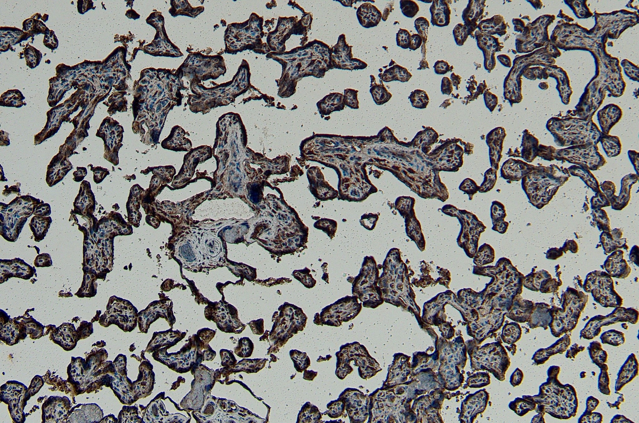 Immunohistochemistry: Paraffin-embedded Human placenta tissue. Antigen Retrieval: Heat mediation was performed in Citrate buffer (pH 6.0). The tissue section was stained with ARG64106 anti-GBX2 antibody at 5 µg/ml dilution followed by HRP-staining.