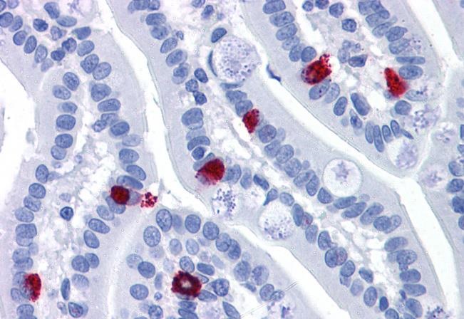 Immunohistochemistry: Paraffin-embedded Human small intestine tissue. Antigen Retrieval: Steam tissue section in Citrate buffer (pH 6.0). The tissue section was stained with ARG64554 anti-GCC2 / GCC185 antibody at 3.75 µg/ml dilution followed by AP-staining.