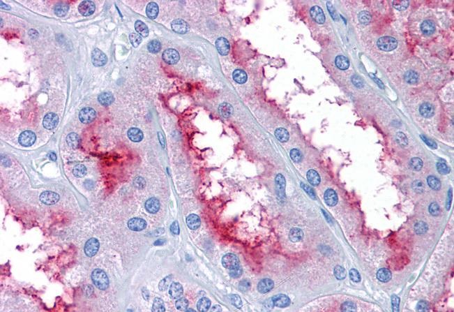Immunohistochemistry: Paraffin-embedded Human kidney tissue. Antigen Retrieval: Steam tissue section in Citrate buffer (pH 6.0). The tissue section was stained with ARG64554 anti-GCC2 / GCC185 antibody at 3.75 µg/ml dilution followed by AP-staining.