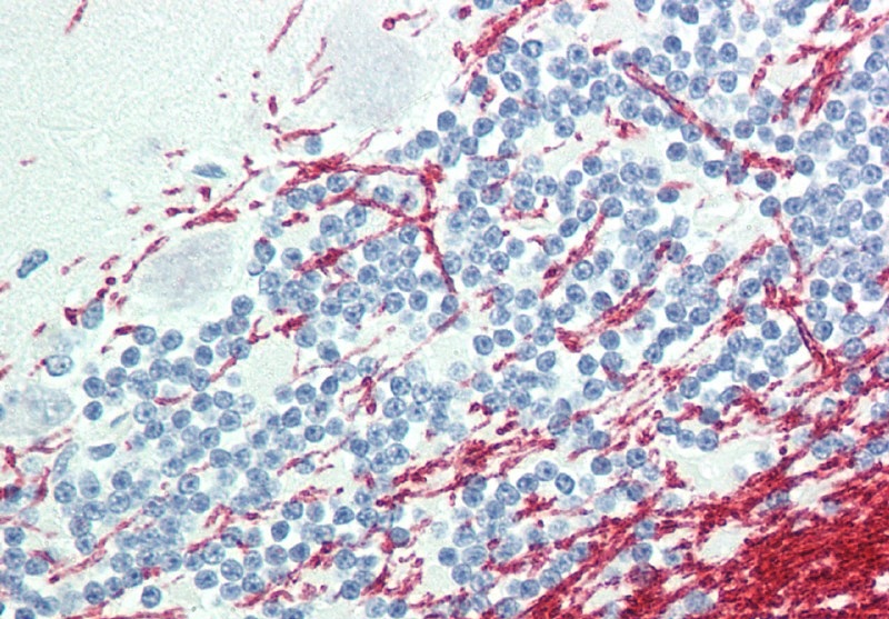 Immunohistochemistry: Paraffin-embedded Human cerebellum tissue. Antigen Retrieval: Steam tissue section in Citrate buffer (pH 6.0). The tissue section was stained with ARG64624 anti-GCH1 antibody at 5 µg/ml dilution followed by AP-staining.