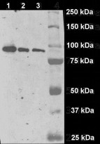 Western blot: 1) 800 pg, 2) 400 pg, and 3) 200 pg of S2 cell lysate stained with ARG53933 anti-GCPII / PSMA antibody [GCP-04].